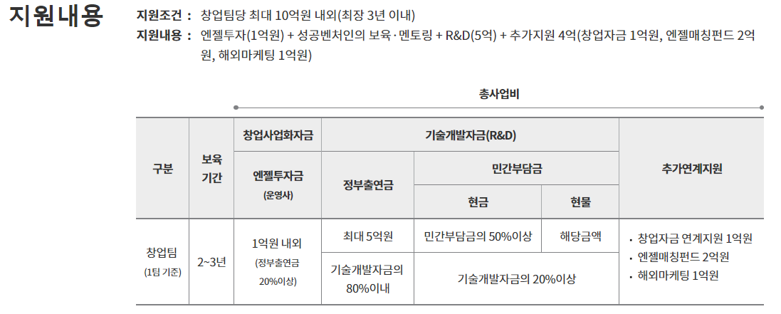 창업팀 기준 팁스 운영사에서 1억을 투자받으면 정부에서 최대 5억 원을 지원해준다는 내용이 가장 큰 부분이고 이 외에 해외마케팅, 사업화 등으로 1억 원씩 그리고 엔젤 매칭펀드를 통해서 비용을 더 받을 수 있는 방법도 있지만..보통은 팁스를 하고 나서 과중한 서류업무를 피하기 위해서 운용사(1억) 팁스정부출연금(5억)+해외마케팅(1억)+사업화자금(1억) 등으로 많이들 받고 있으신 걸로 알고 있습니다.