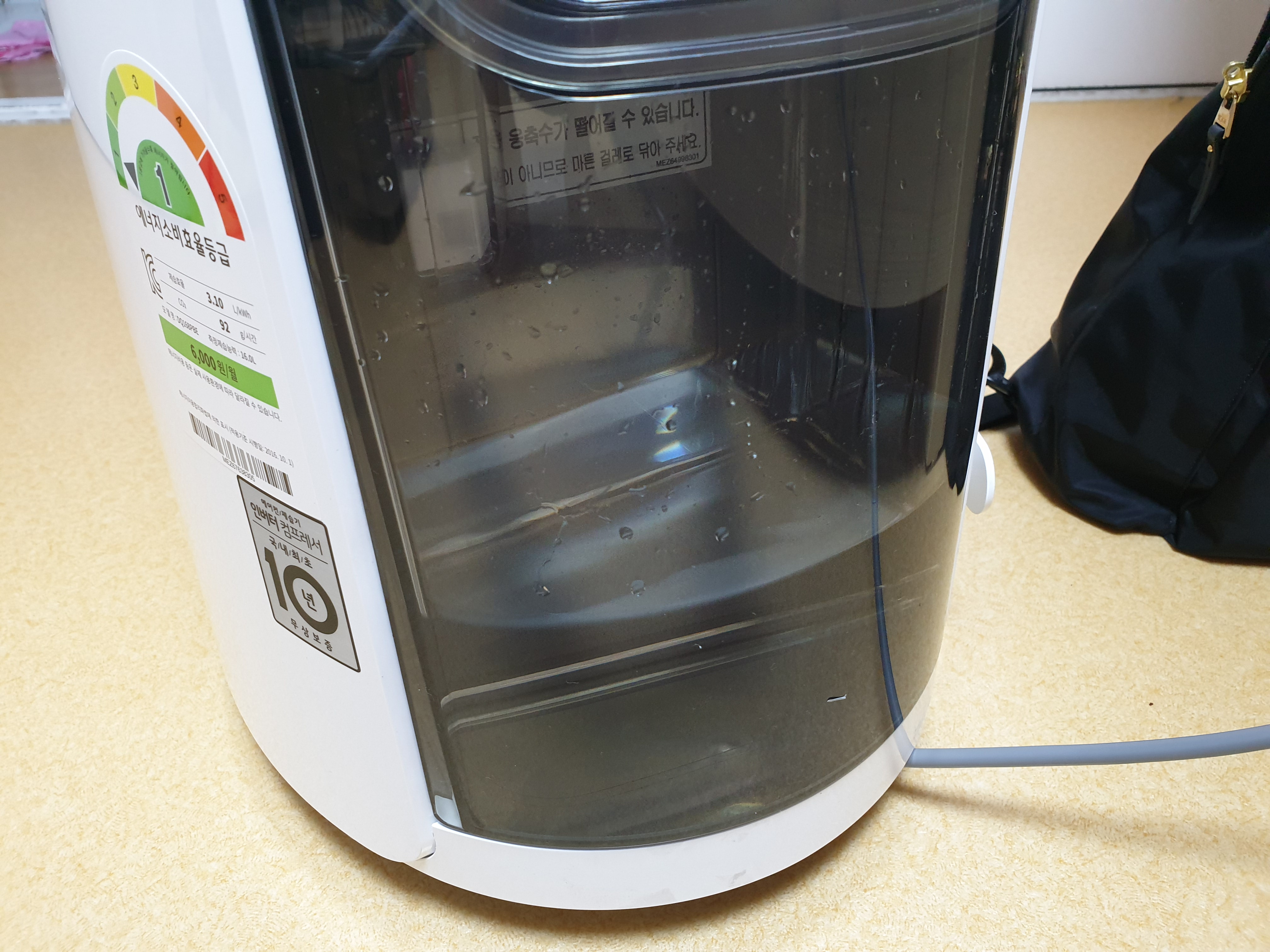태풍이 와서 온종일 비가 와서 그런지 한두시간 돌려주면 1/5 정도 차는걸 보면 제습은 상당히 잘 되는 것 같네요. 그리고 틀고 조금 지나면 계속 물이 똑똑똑~ 하면서 떨어집니다.