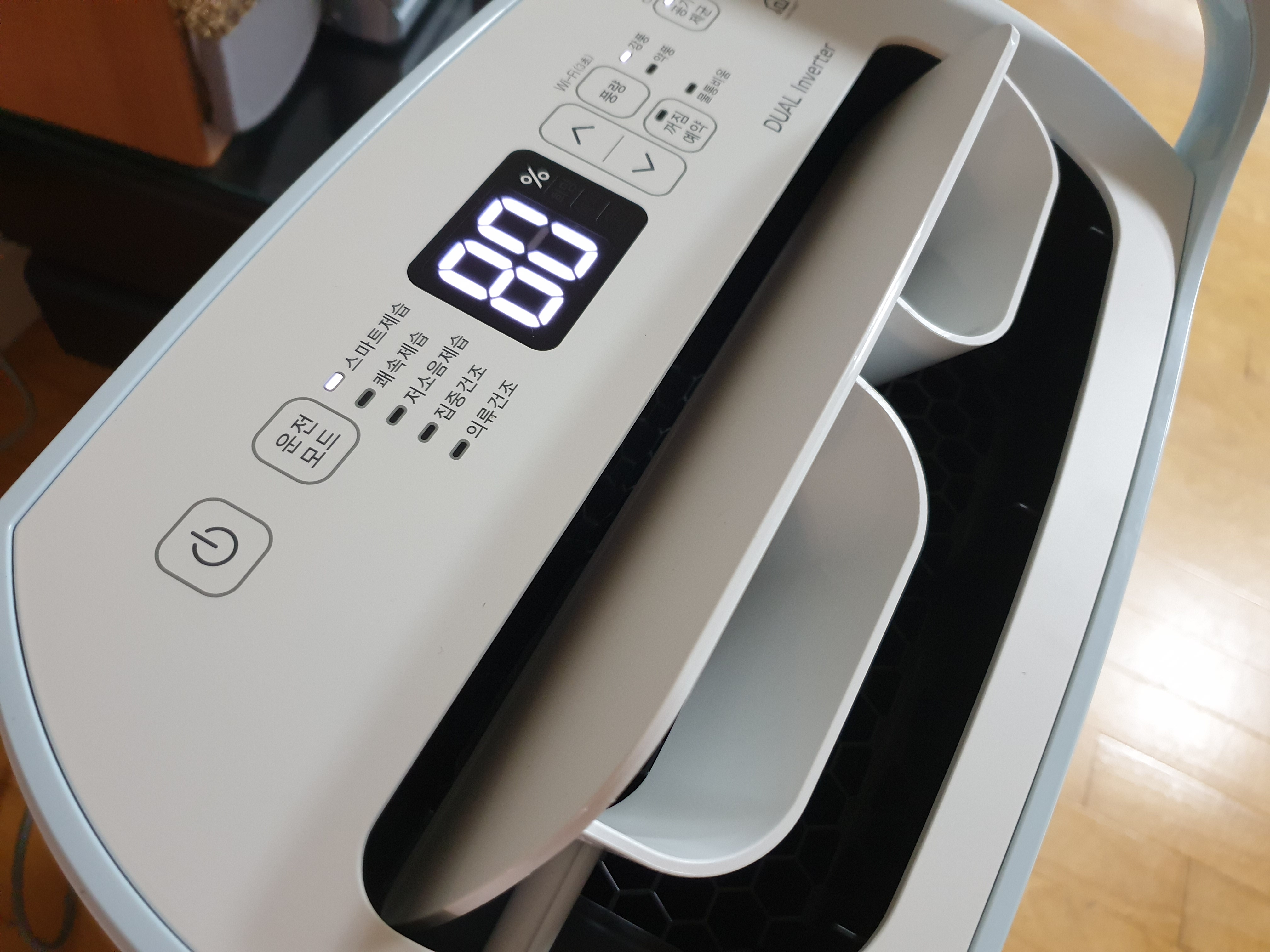 이정도라면 어느정도 타협할만하네요. 그리고 스마트제습의 경우는 온도설정하고 그 온도만큼 떨어질때까지 돌아간다고 생각하시면 되는데 바람이 강하게 나옵니다. 잘때 습도조절 하실 분들은 저소움제습으로 해두시면 될 것 같아요.