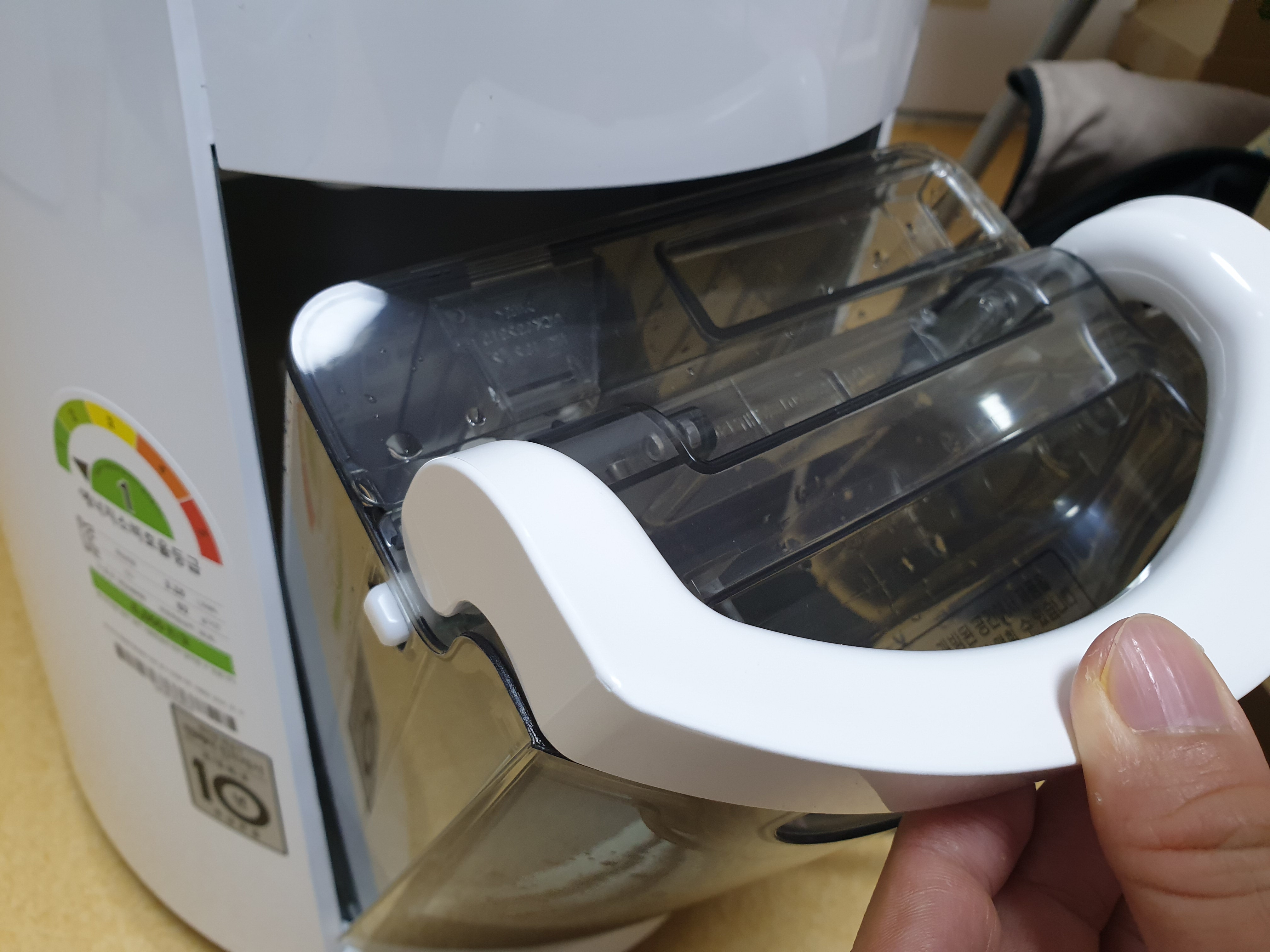 물통은 손으로 잡아 당기기면 하면 빠지고 물통 비우기도 쉬운 편입니다.