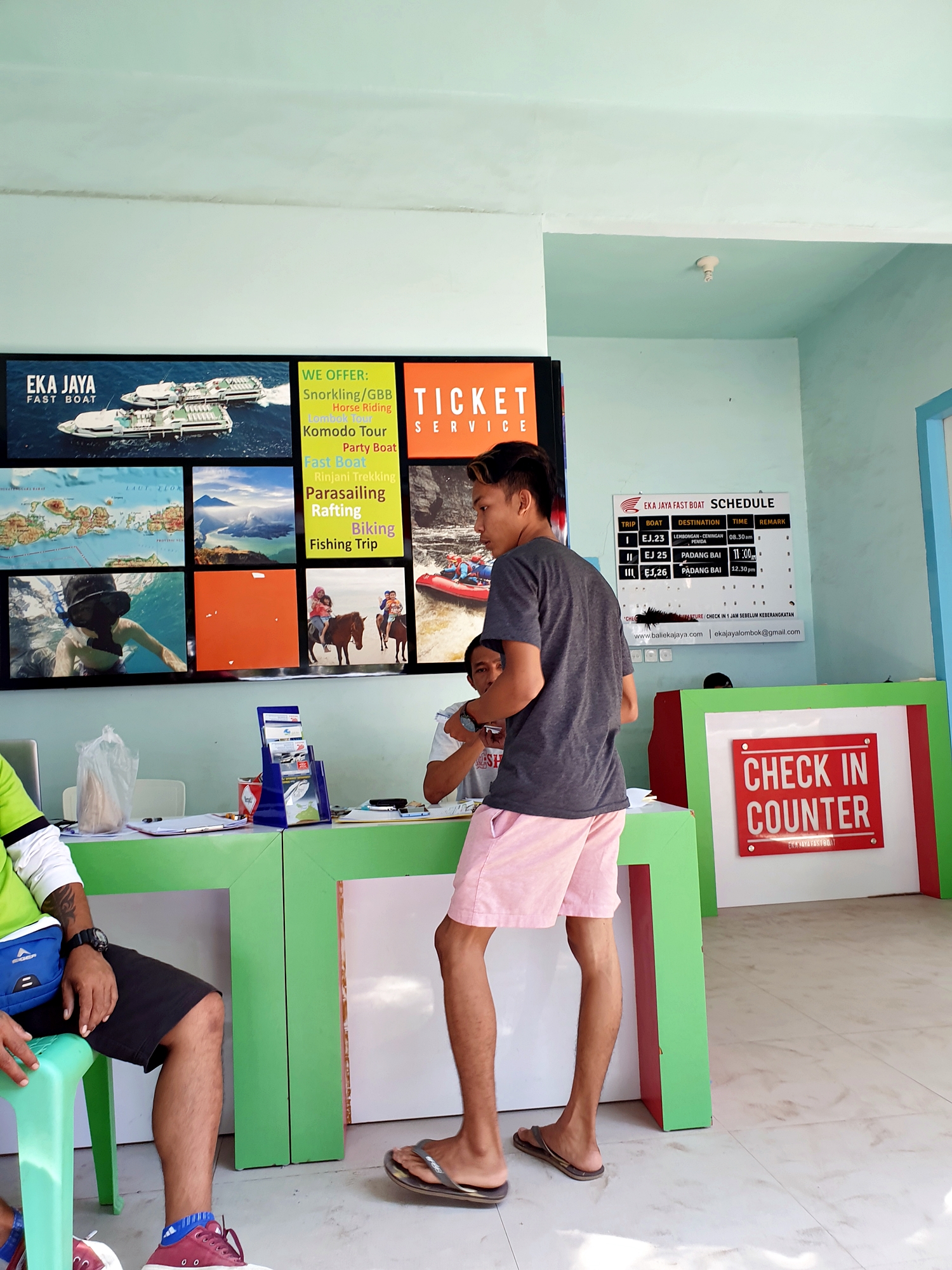 발리여행 길리트리왕안에 도착한 후에는 먼저 돌아가는 티켓을 컴펌 받아야 합니다. 2일전에 하면 되는데 2박3일인 경우는 도착한 후 바로. 아닌 경우는 2일전에 컨펌 받으시면 되요. 티켓을 에카자야 사무실에 보여주고 확인 받으시면 됩니다. 돌아오는 배편 시간을 미리 생각해두시면 좋아요~!