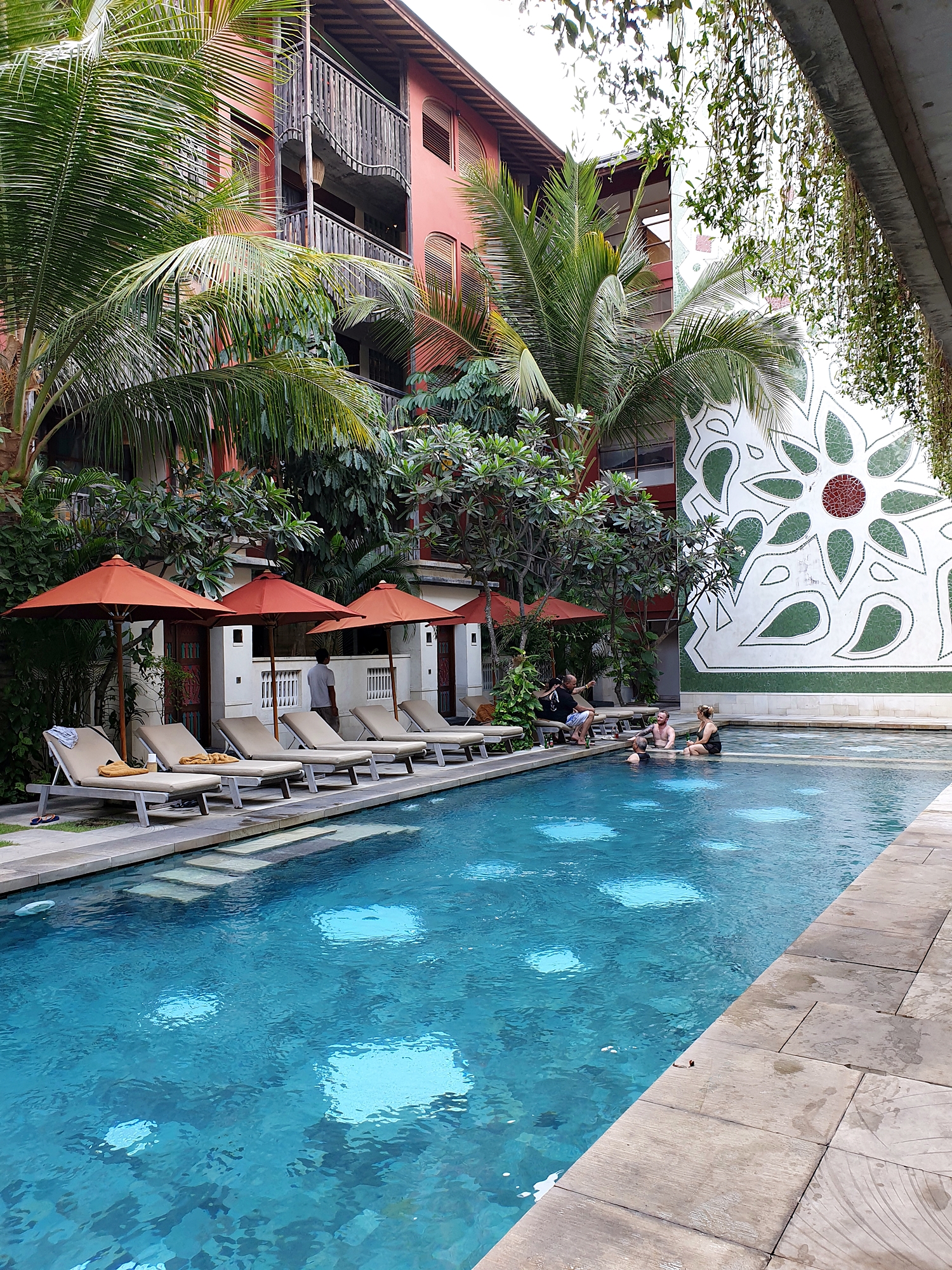 한쪽끝은 유아용풀로 사용할 수 있을 정도로 낮은 풀이 있습니다. 보통 그쪽에서 사람들이 모여서 맥주를 마시는 경우도 있더군요. 가족끼리 간다면 유아플쪽 썬베드 이용하시면 편하실 것 같아요.