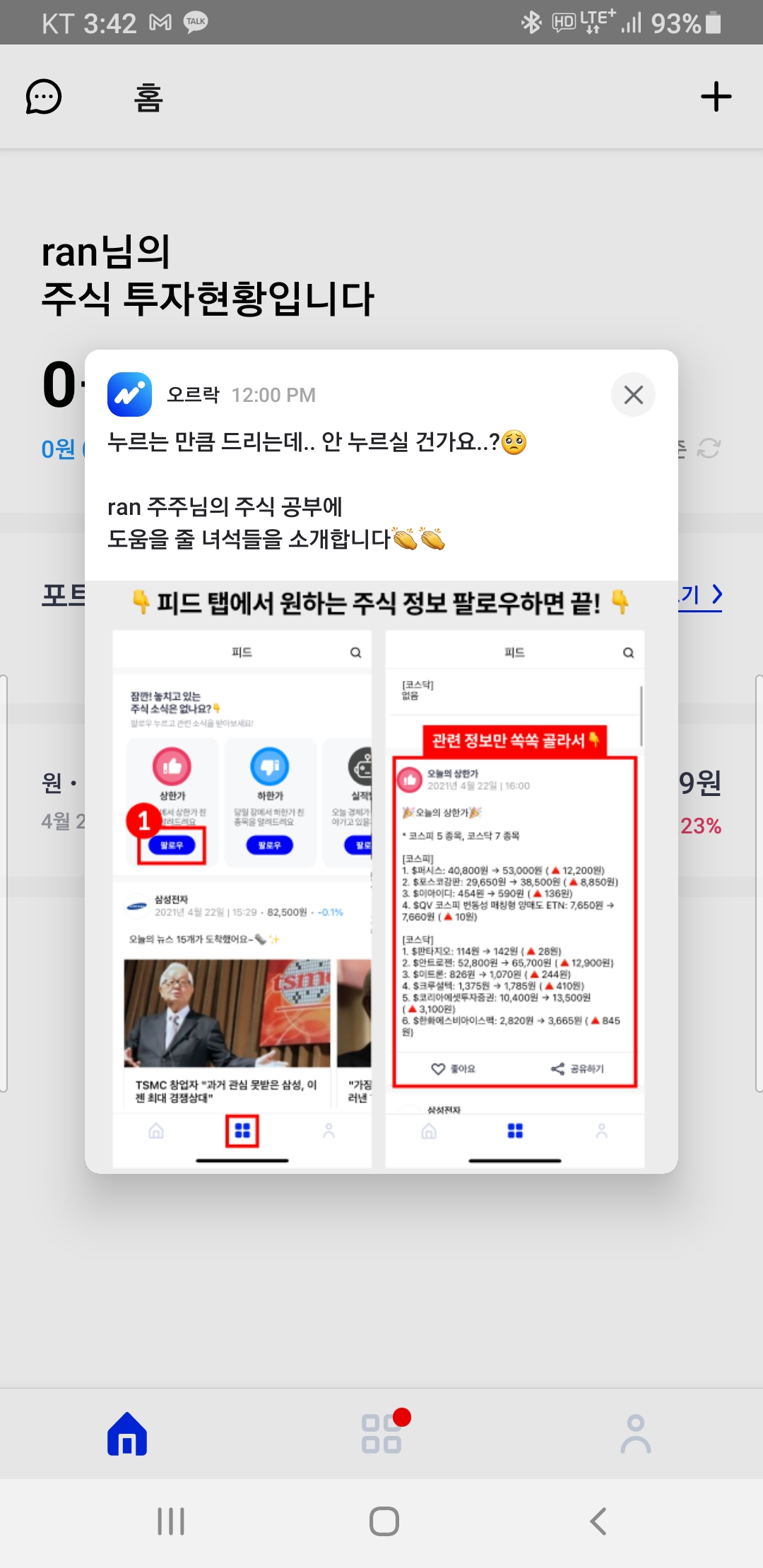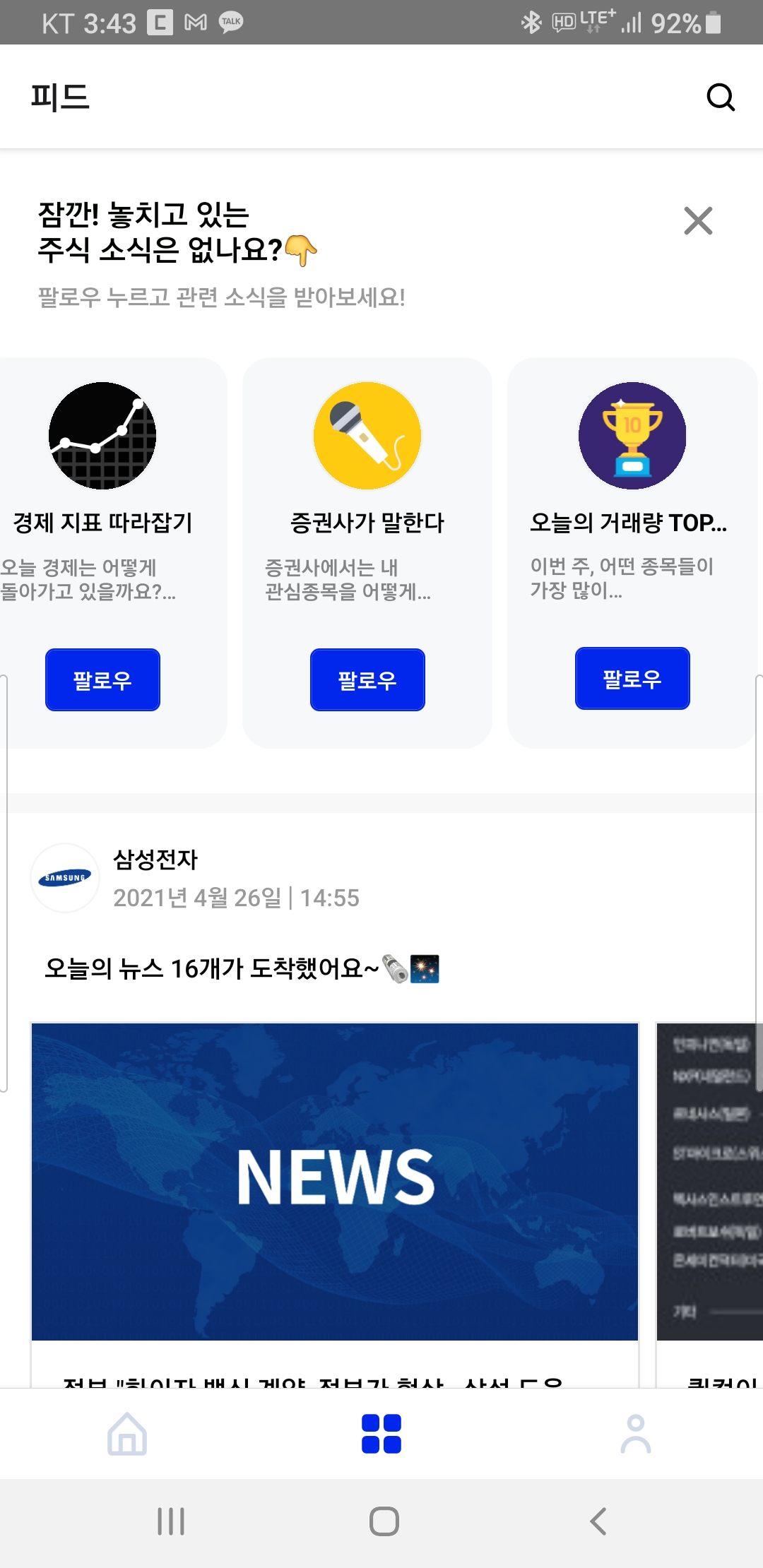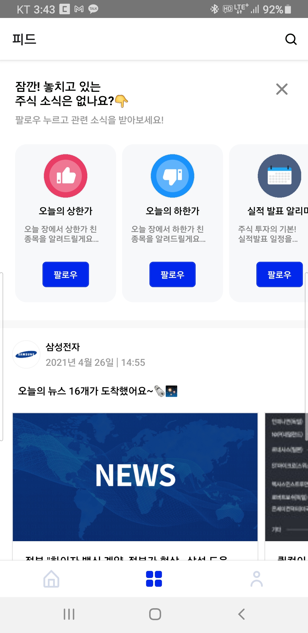 ▲ 피드에서는 팔로우 하고 있는 종목들의 소식들을 볼 수 있는데..