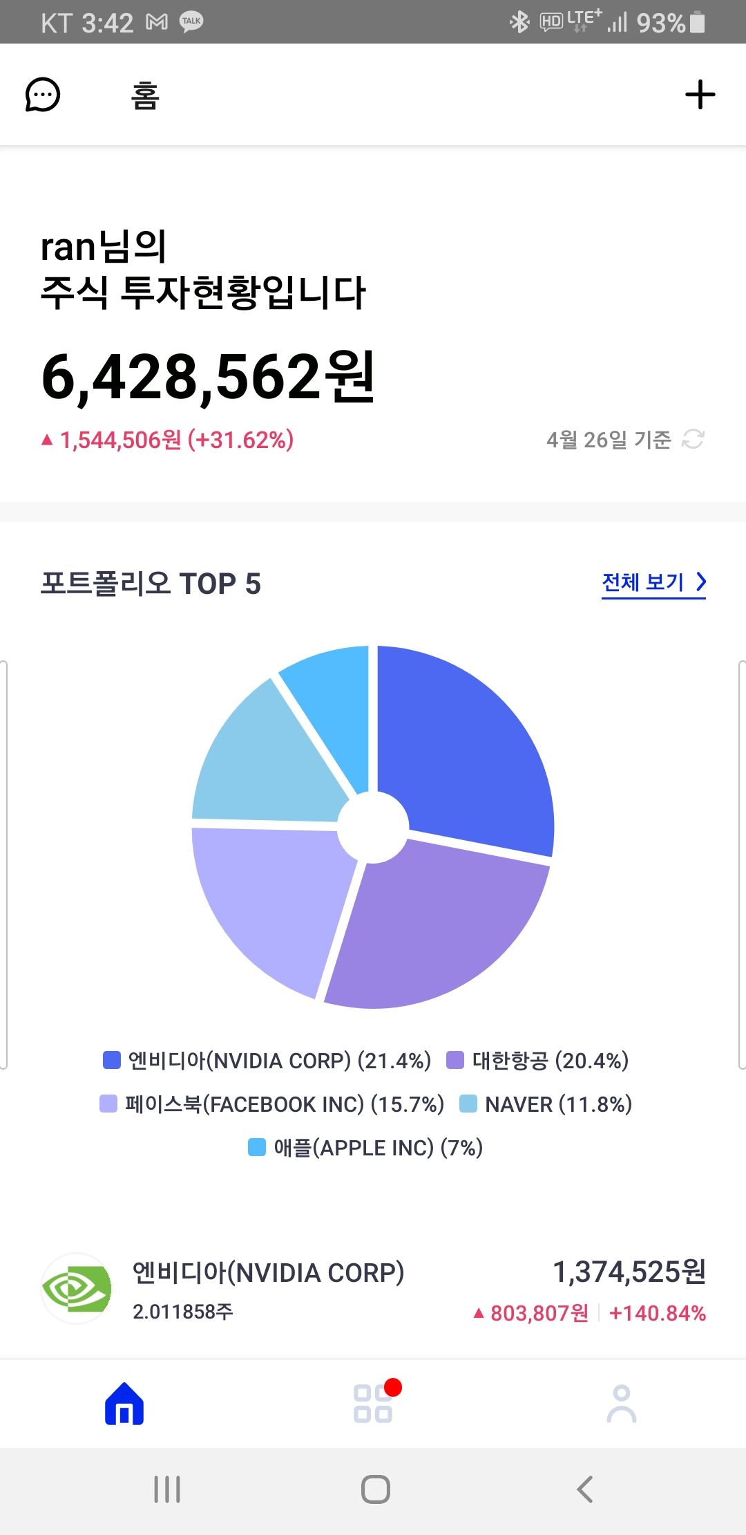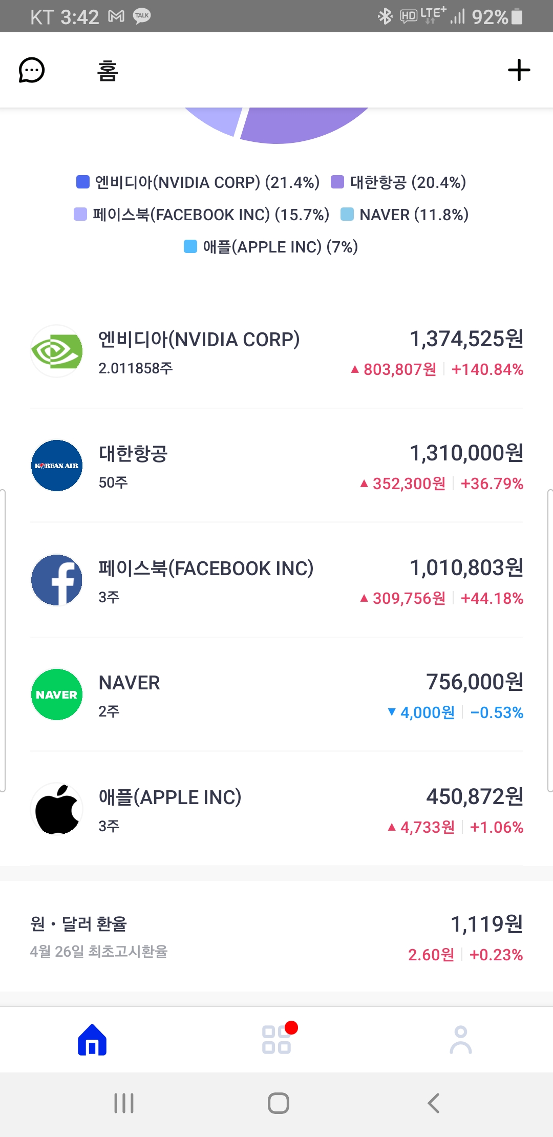 메인 화면에 들어가게 되면 이렇게 보유하고 있는 주식을 포토폴리오로 변환해서 보이게 됩니다.