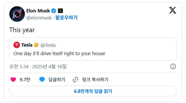 휴대폰으로 알림을 받고, 밖을 내다보니 당신의 새 테슬라가 자율적으로 드라이브웨이에 들어오는 모습을 상상해보세요. 이건 정말 미래적인 경험이 아닐까요?