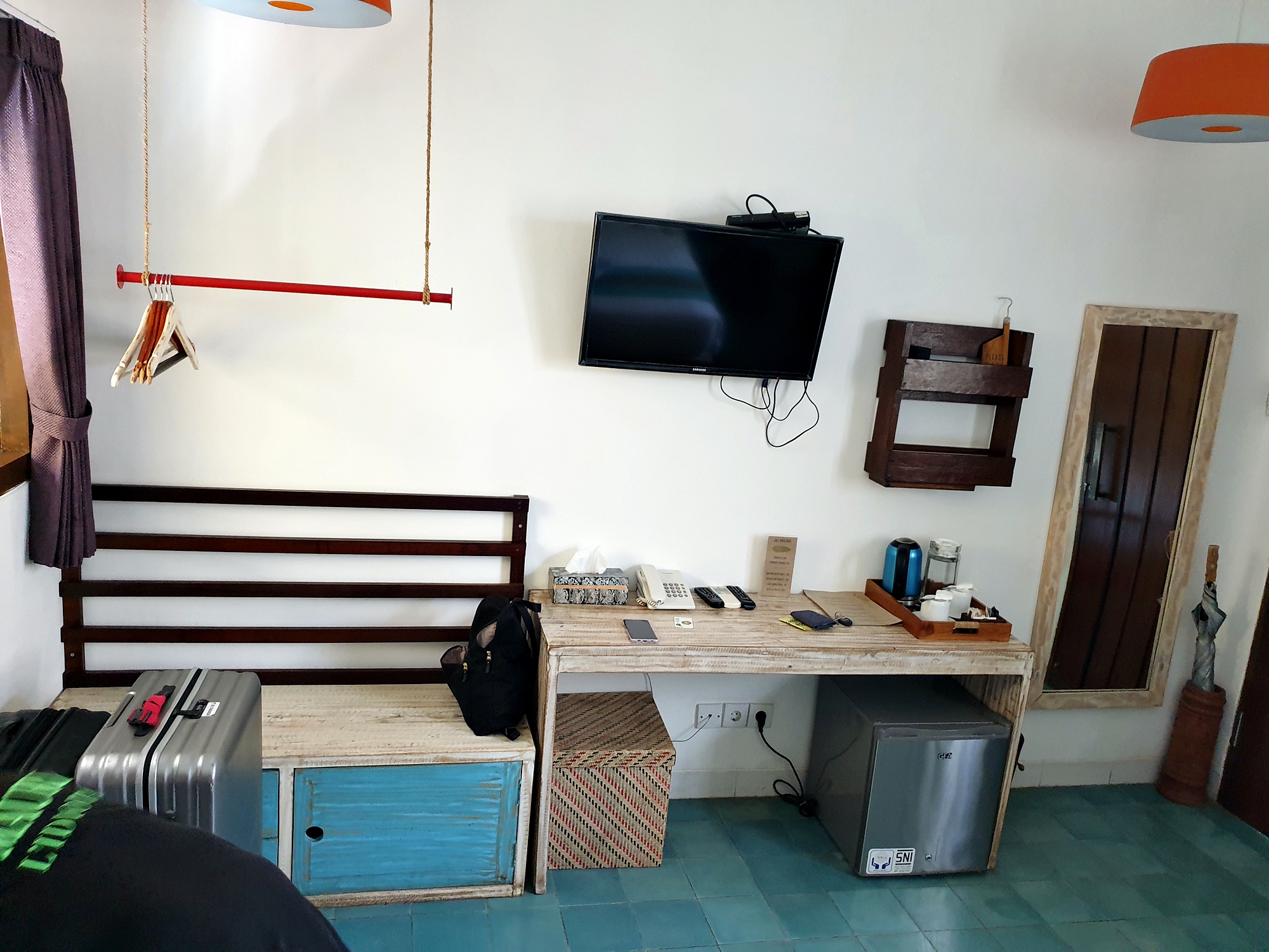▲ 내부도 섬이라는걸 생각하면 꽤 잘 꾸며놨습니다. 실용적이기도 하구요. TV가 좀 작은 것 외에는 특별히 불편한 것도 없었네요. 그리고 TV에서 tvn 방송이 나오기 때문에 한국 방송도 보실 수 있습니다. 내부 시설도 그렇고 가격대로 왜 가성비가 좋은지 알겠더군요. 그리고 샤워실겸 화장실이 천장이 뚫려 있는 형태인데 천으로 막혀 있어서 옆건물 등에서 볼수 있는 형태는 아닙니다.